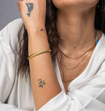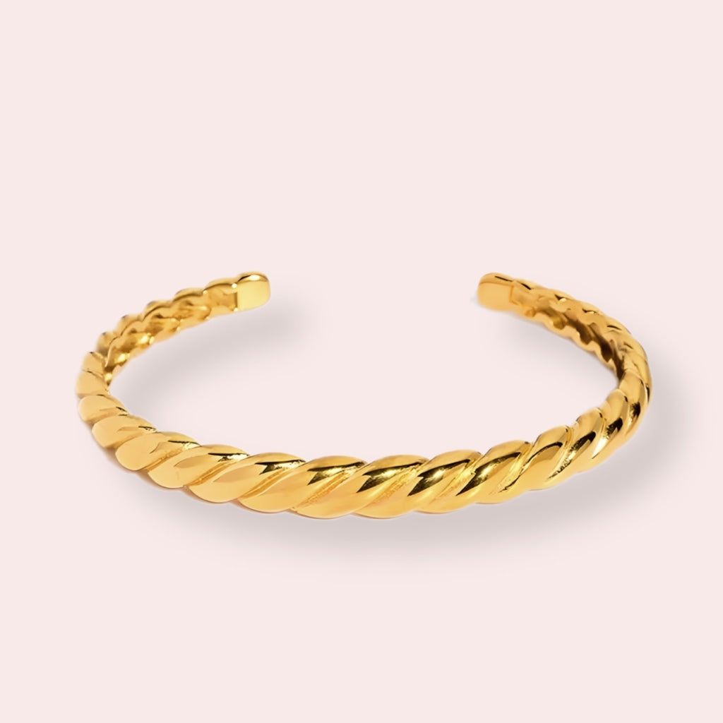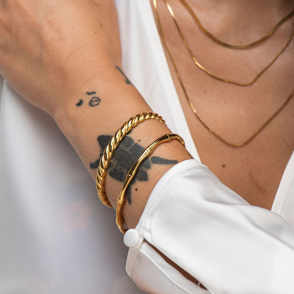 Meera Twisted Indian Gold Handcrafted Bangle Crafted with meticulous attention to detail, this tarnish-free bangle combines traditional Indian artistry with contemporary durability. The twisted design showcases skilled handiwork, whilst the adjustable sizing ensures a perfect fit for any wrist. Engineered to resist tarnishing, this piece maintains its lustrous finish through years of wear, making it a timeless addition to your jewellery collection. An investment in quality craftsmanship that transcends seasons and trends.
